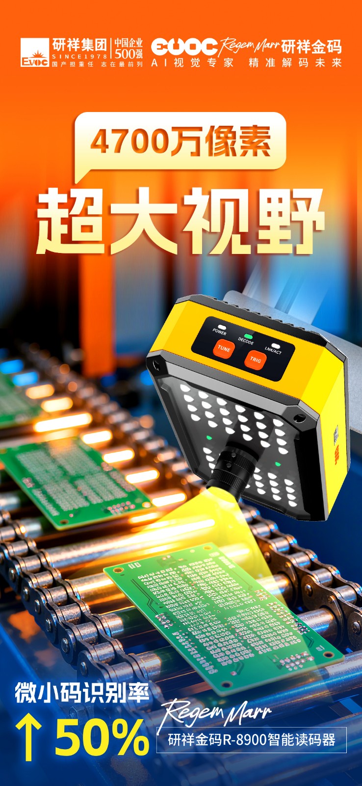 作为行业首款4700万像素的智能读码器,公海jcjc5500R-8900单次识读即可覆盖500+条码,视野范围高达常规读码器的25倍。
